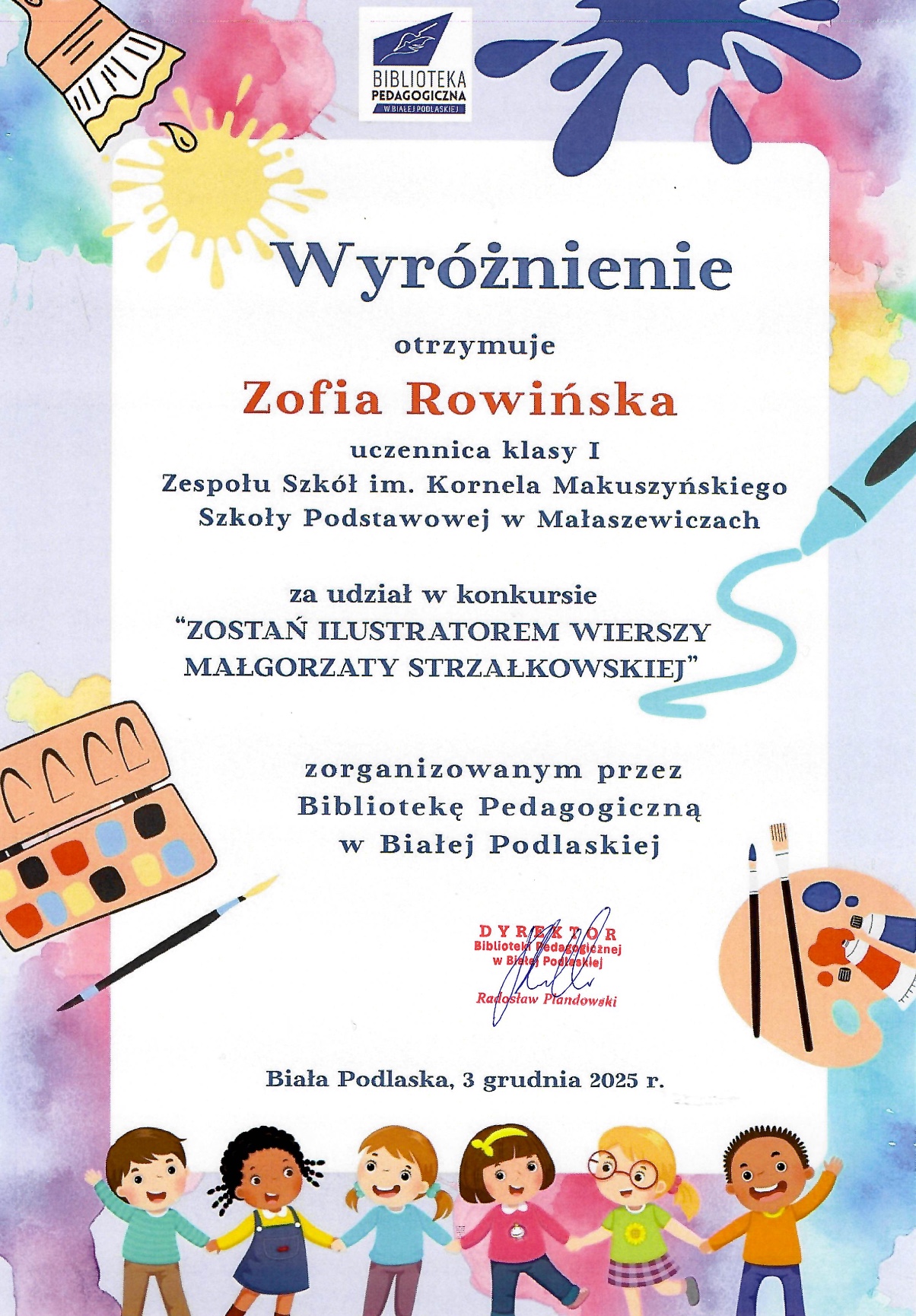 3 grudnia br. w Bibliotece Publicznej w Białej podlaskiej odbyło się uroczyste podsumowanie powiatowego konkursu plastycznego „Zostań ilustratorem wierszy Małgorzaty Strzałkowskiej”, adresowanego do uczniów klas I-III. Celem konkursu było: promowanie twórczości Małgorzaty Strzałkowskiej, rozwijanie zainteresowań literackich dzieci, rozwijanie wrażliwości plastycznej i wyobraźni dzieci, prezentacja i popularyzacja twórczości plastycznej dzieci, promocja uczniów uzdolnionych plastycznie. Zadaniem uczestników było wykonanie samodzielnej ilustracji do jednego z pięciu wierszy Małgorzaty Strzałkowskiej: „Krasnoludek”, „Potwór”, „Wiosna”, „W ZOO”, „Ciupineczka”. Uczniowie wykorzystali moc wyobraźni i kolorów, aby stworzyć kreatywne prace ilustrujące wiersze poetki. Laureaci otrzymali dyplomy oraz nagrody rzeczowe. Komisja konkursowa przyznała wyróżnienie Zofii Rowińskiej – uczennicy klasy II. Gratulujemy Zosi i dziękujemy wszystkim uczestnikom konkursu oraz ich opiekunom.
