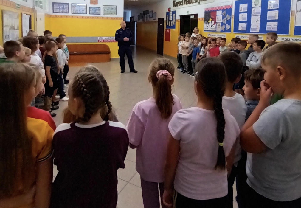 Funkcjonariusz przypomniał młodzieży o podstawowych zasadach ruchu drogowego, znaczeniu noszenia odblasków i bezpiecznego korzystania z przejść dla pieszych. Omówiono także zasady bezpiecznej jazdy rowerem, w tym konieczność używania kasku, świateł i przestrzegania przepisów ruchu drogowego. Poruszono także kwestie przemocy rówieśniczej, zarówno psychicznej jak i fizycznej, sposoby reagowania w sytuacjach zagrożenia oraz możliwości uzyskania wsparcia w przypadku doświadczania przemocy. Policjant podkreślił, że każdy powinien reagować na przejawy agresji i nie pozostawać obojętnym wobec krzywdzenia innych, a osoby stosujące przemoc muszą liczyć się z konsekwencjami prawnymi i wychowawczymi.
