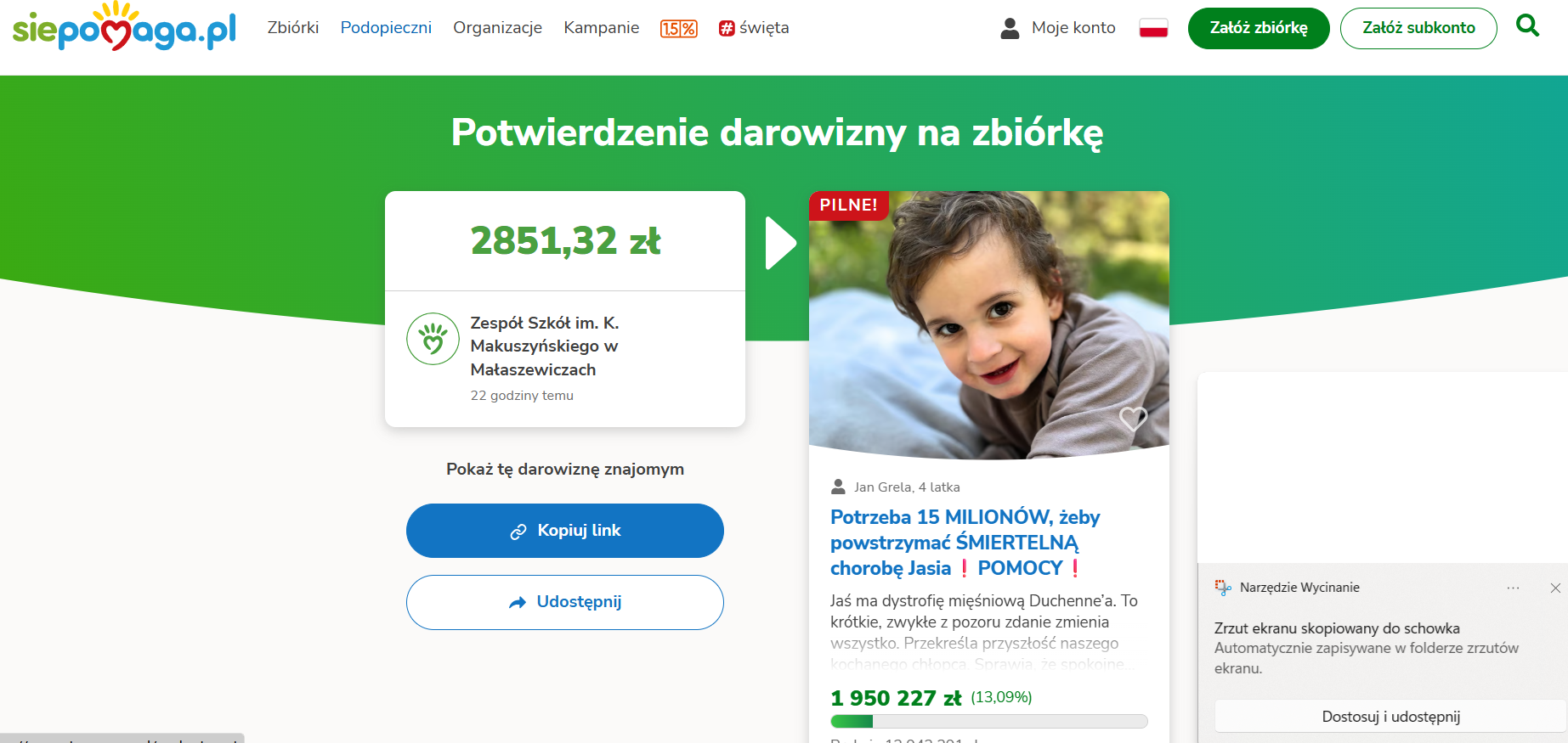 W naszej szkole 9 grudnia 2025 r. została przeprowadzona akcja charytatywna #SzkołyDlaJasia, której celem było zebranie środków na terapię genową dla Jasia Greli – małego mieszkańca Sobolewa chorującego na dystrofię mięśniową Duchenne’a (DMD). To była zbiórka wyjątkowa, bo jej stawką jest zdrowie i życie Jasia. Terapia genowa to jego jedyna szansa na zatrzymanie skutków choroby, która z każdym dniem odbiera mu siły. Koszt leczenia to aż 15 milionów złotych - dlatego każda, nawet najmniejsza pomoc ma ogromne znaczenie. Udział w akcji to nie tylko realna pomoc w walce o zdrowie Jasia, ale też piękna lekcja empatii i solidarności dla uczniów oraz całej społeczności szkolnej. Szkolne Koło Wolontariatu przeprowadziło loterię fantową. Uczniowie z poszczególnych klas przynosili maskotki, gry planszowe, układanki, zabawki, książki. Przez cały tydzień trwała zbiórka zabawek, które zostały przeznaczone na fanty. W Dniu Wolontariusza odbyła się loteria. Chętni uczniowie kupowali losy w cenie 5 zł. Każdy los wygrywał. Loterię przygotowały: p. A. Borowik, p. M. Mikołajczak wraz z uczennicami klasy VI: Zofią Mroczek i Aleksandrą Fedosiuk. Loteria cieszyła się wielkim zainteresowaniem uczniów. Przyniesione zabawki były atrakcyjne. Był to niesamowity dzień dla uczniów, szczególnie tych najmłodszych. Każdy miał okazję wylosować jakąś niespodziankę.