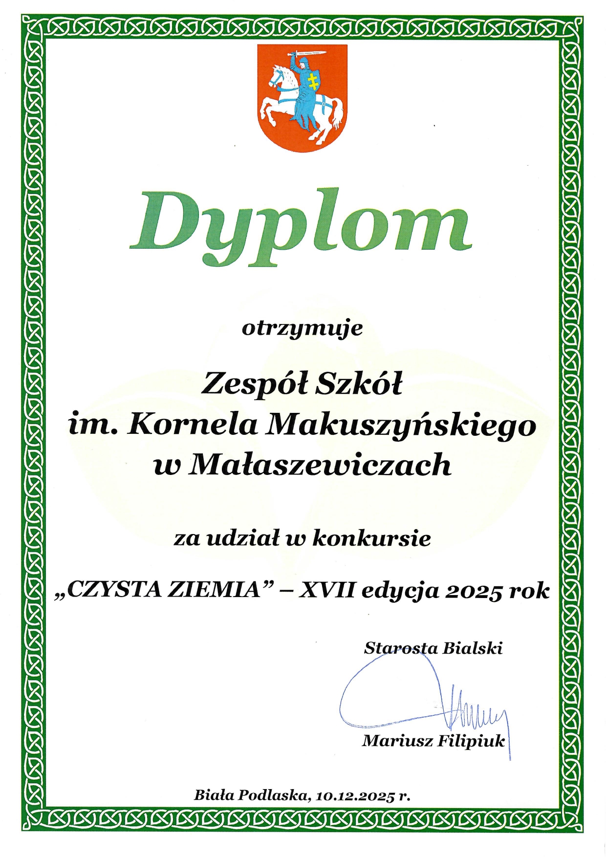 Nasza szkoła, wzorem lat ubiegłych, wzięła udział w XVII edycji konkursu ekologicznego „Czysta Ziemia”, którego uroczyste podsumowanie odbyło się 10 grudnia. Konkurs adresowany jest do uczniów szkół podstawowych i ponadpodstawowych z terenu powiatu bialskiego. Celem konkursu jest promowanie działań na rzecz ochrony środowiska, szczególnie poprzez dbanie o czystość najbliższego otoczenia, segregację odpadów oraz podejmowanie inicjatyw proekologicznych. Nasza szkoła otrzymała nagrodę pieniężną w wysokości trzystu złotych, która stanowi wyróżnienie za aktywny udział oraz działania ekologiczne podejmowane w ramach konkursu. Doceniono także uczniów za szczególne zaangażowanie w realizację działań ekologicznych. W wykonywanie działań na rzecz konkursu szczególnie zaangażowała się uczennica klasy VIII – Karolina Wysokińska, która otrzymała kosz słodyczy.